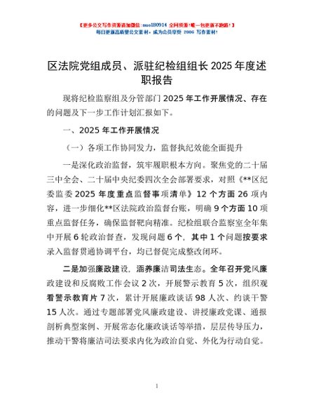 / 区法院党组成员、派驻纪检组组长2025年度述职报告