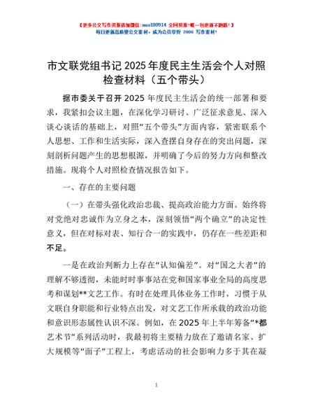 / 市文联党组书记2025年度民主生活会个人对照检查材料(五个带头)