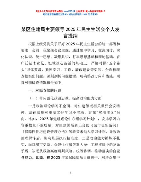 / 某区住建局主要领导2025年民主生活会个人发言提纲