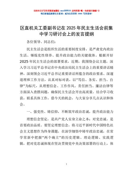 / 区直机关工委副书记在2025年民主生活会前集中学习研讨会上的发言提纲