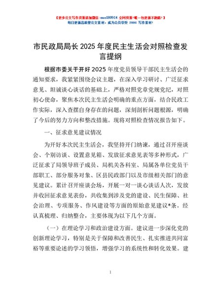 / 市民政局局长2025年度民主生活会对照检查发言提纲