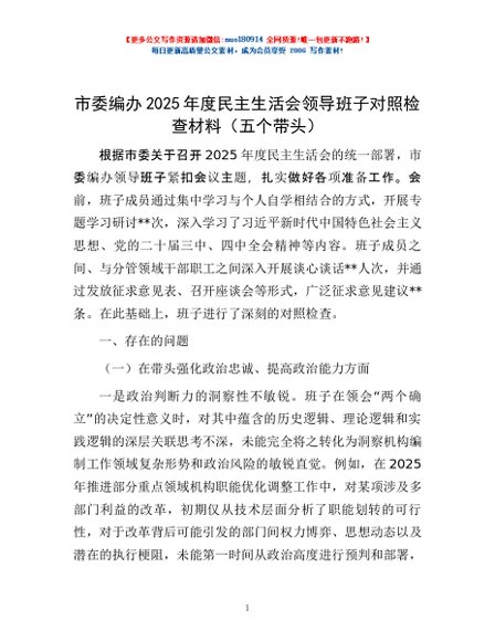 / 市委编办2025年度民主生活会领导班子对照检查材料(五个带头)