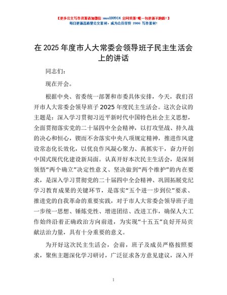 / 在2025年度市人大常委会领导班子民主生活会上的讲话
