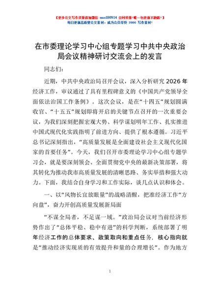 / 在市委理论学习中心组专题学习中共中央政治局会议精神研讨交流会上的发言