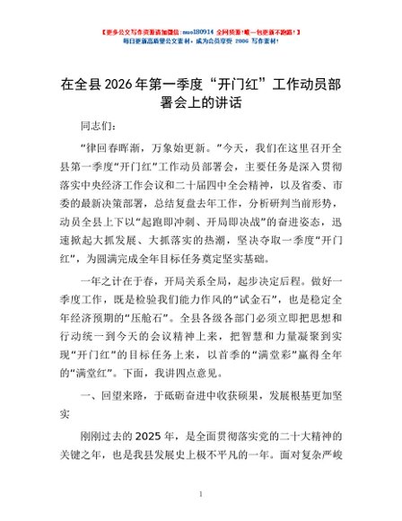 / 在全县2026年第一季度“开门红”工作动员部署会上的讲话