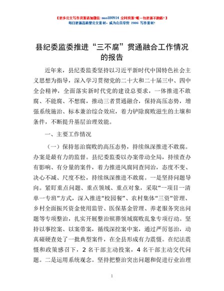 / 县纪委监委推进“三不腐”贯通融合工作情况的报告