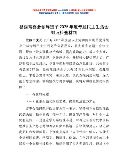 / 县委常委会领导班子2025年度专题民主生活会对照检查材料