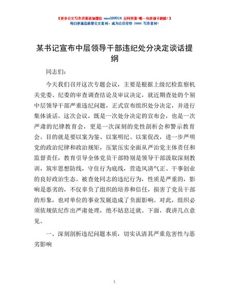 / 某书记宣布中层领导干部违纪处分决定谈话提纲