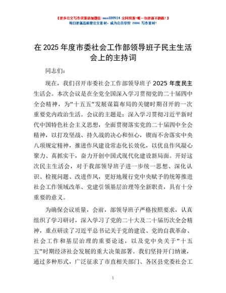 / 在2025年度市委社会工作部领导班子民主生活会上的主持词
