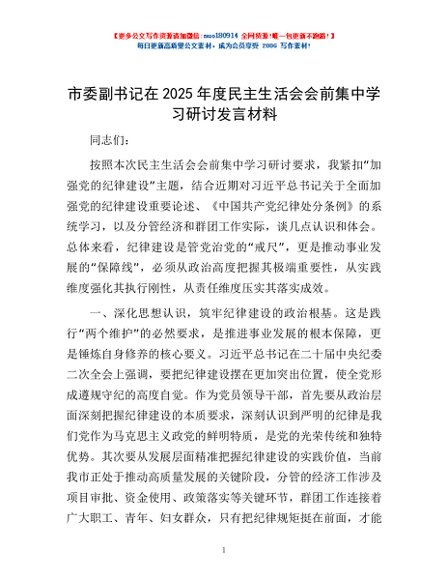 / 市委副书记在2025年度民主生活会会前集中学习研讨发言材料