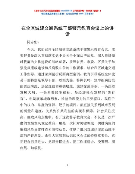 / 在全区城建交通系统干部警示教育会议上的讲话