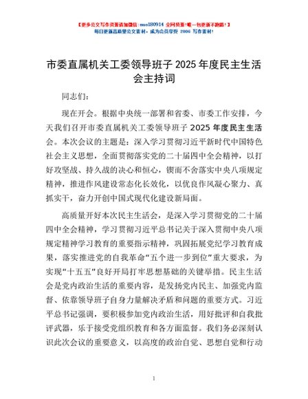 / 市委直属机关工委领导班子2025年度民主生活会主持词