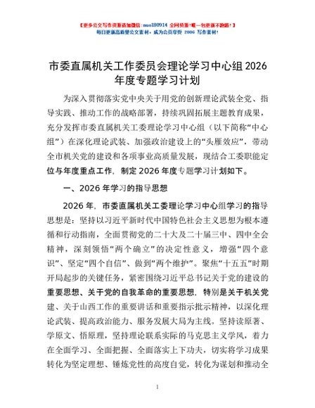 / 市委直属机关工作委员会理论学习中心组2026年度专题学习计划
