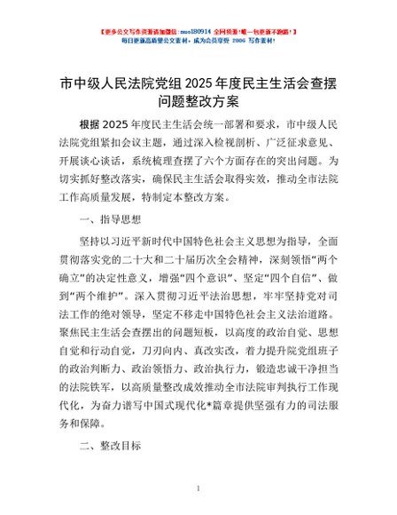 / 市中级人民法院党组2025年度民主生活会查摆问题整改方案