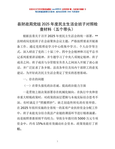/ 县财政局党组2025年度民主生活会班子对照检查材料(五个带头)