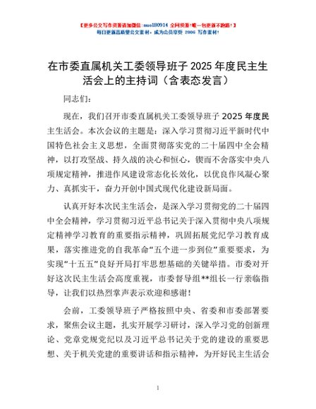 / 在市委直属机关工委领导班子2025年度民主生活会上的主持词(含表态发言)
