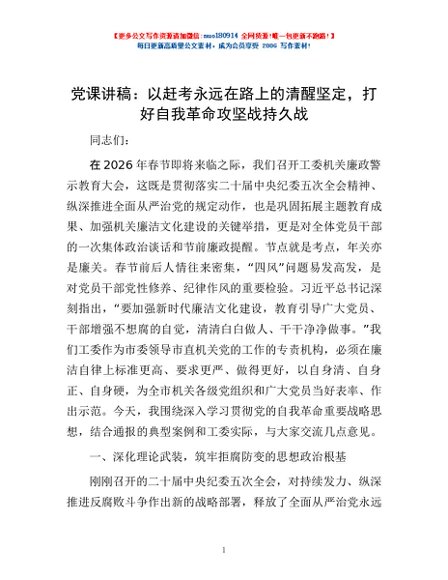 / 党课讲稿:以赶考永远在路上的清醒坚定,打好自我革命攻坚战持久战