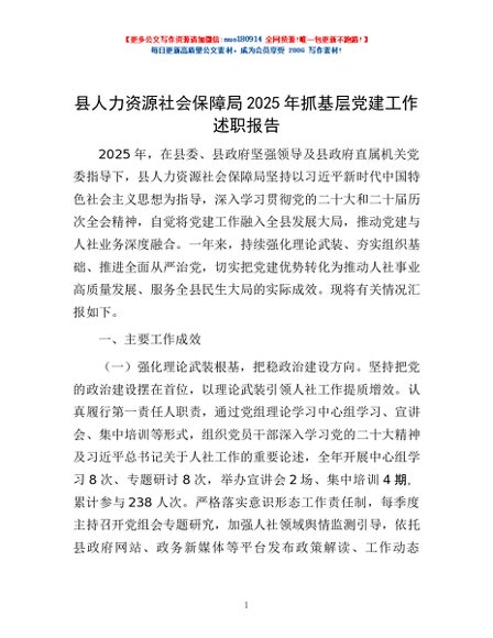/ 县人力资源社会保障局2025年抓基层党建工作述职报告