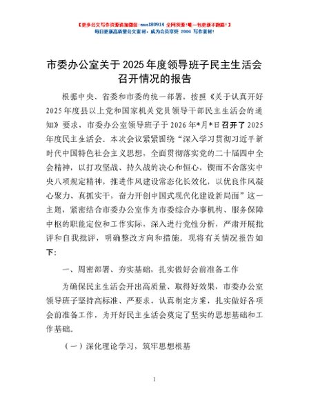 / 市委办公室关于2025年度领导班子民主生活会召开情况的报告
