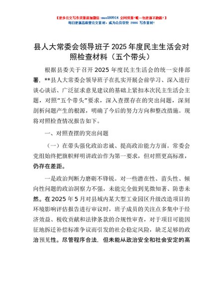 / 县人大常委会领导班子2025年度民主生活会对照检查材料(五个带头)