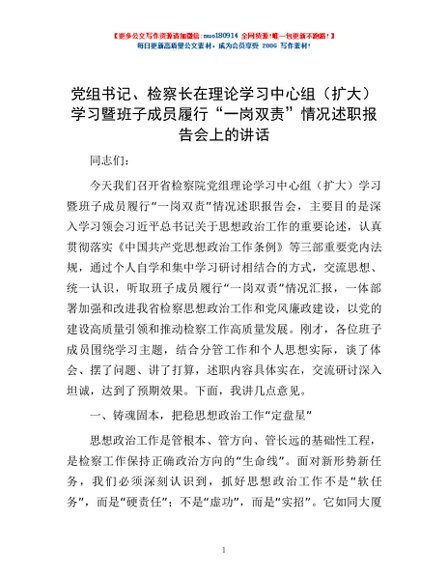 / 党组书记、检察长在理论学习中心组(扩大)学习暨班子成员履行“一岗双责”情况述职报告会上的讲话