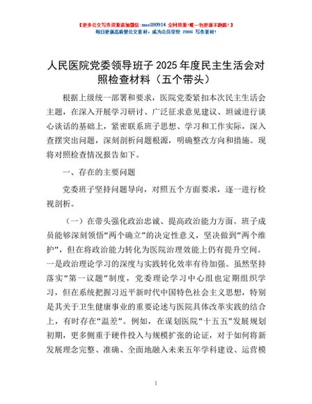 / 人民医院党委领导班子2025年度民主生活会对照检查材料(五个带头)