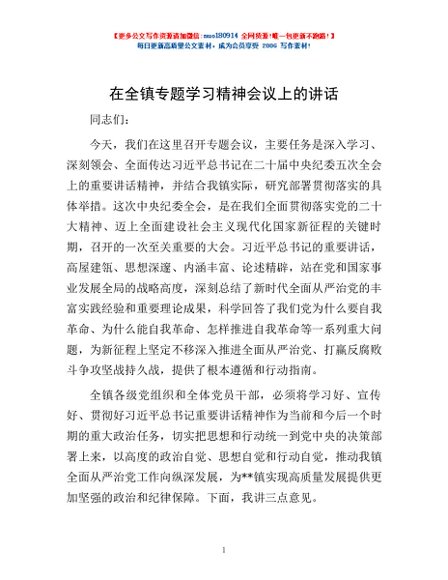 / 在全镇专题学习精神会议上的讲话