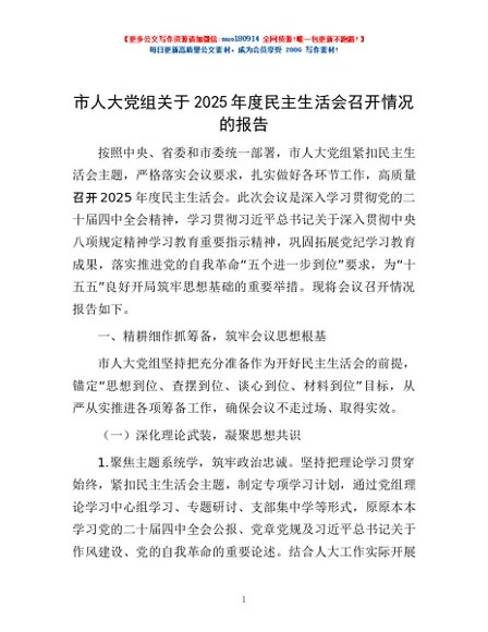 / 市人大党组关于2025年度民主生活会召开情况的报告
