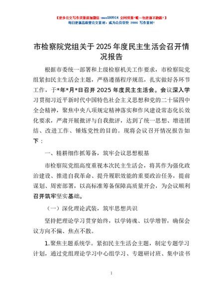 / 市检察院党组关于2025年度民主生活会召开情况报告