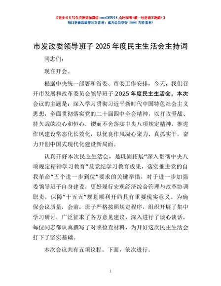 / 市发改委领导班子2025年度民主生活会主持词