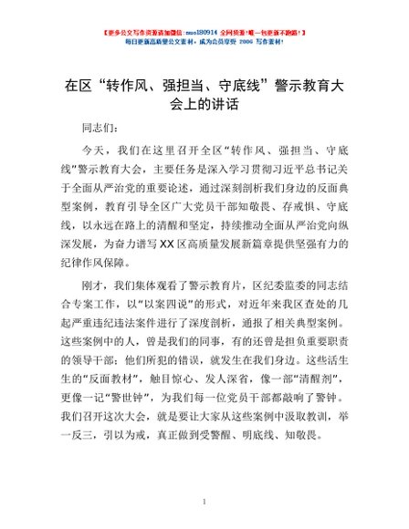 / 在区“转作风、强担当、守底线”警示教育大会上的讲话