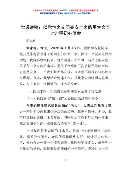 / 党课讲稿:以党性之光照亮安全之路 用生命至上诠释初心使命