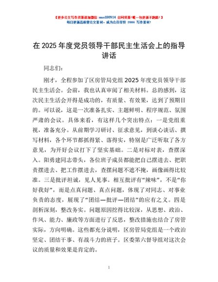 / 在2025年度党员领导干部民主生活会上的指导讲话