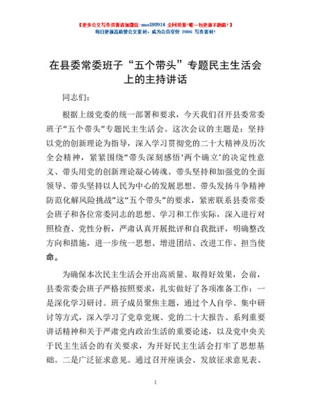/ 在县委常委班子“五个带头”专题民主生活会上的主持讲话