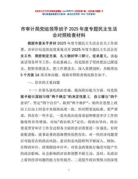 / 市审计局党组领导班子2025年度专题民主生活会对照检查材料