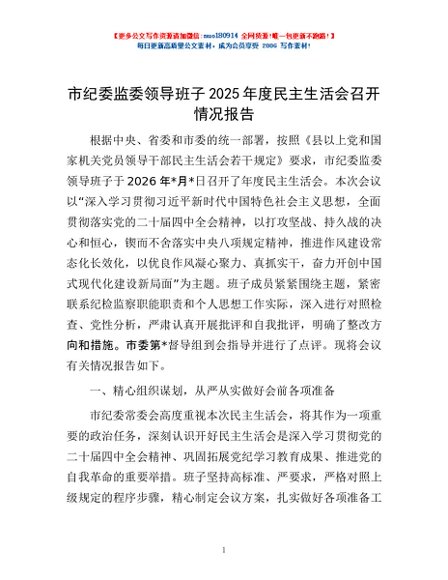 / 市纪委监委领导班子2025年度民主生活会召开情况报告