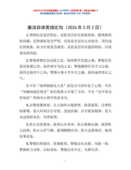/ 廉洁自律类 排比句(2026年2月2日)