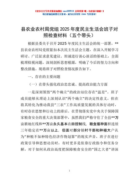 / 县农业农村局党组2025年度民主生活会班子对照检查材料(五个带头)