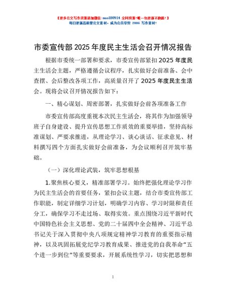 / 市委宣传部2025年度民主生活会召开情况报告