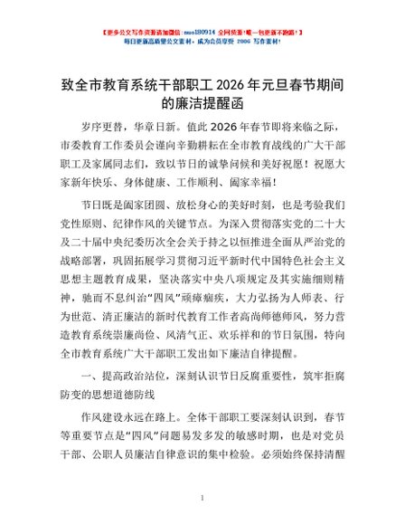 / 致全市教育系统干部职工2026年元旦春节期间的廉洁提醒函