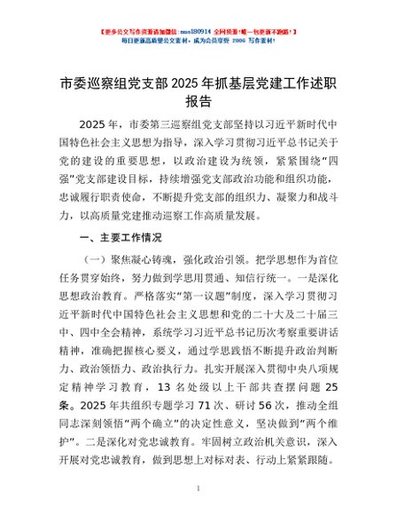 / 市委巡察组党支部2025年抓基层党建工作述职报告
