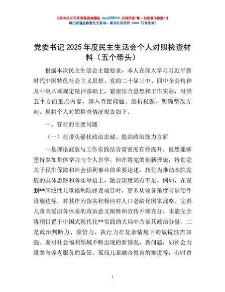 / 党委书记2025年度民主生活会个人对照检查材料(五个带头)