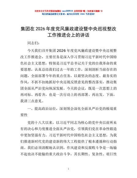 / 集团在2026年度党风廉政建设暨中央巡视整改工作推进会上的讲话