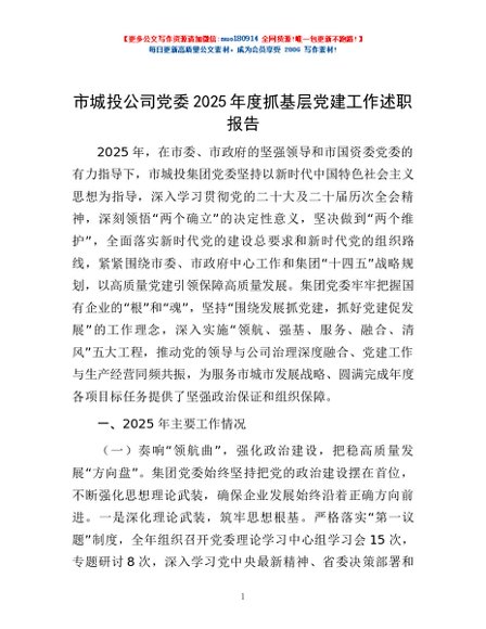 / 市城投公司党委2025年度抓基层党建工作述职报告