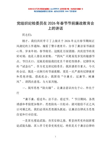 / 党组织纪检委员在2026年春节节前廉政教育会上的讲话