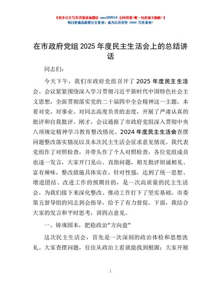 / 在市政府党组2025年度民主生活会上的总结讲话