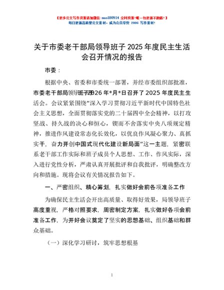 / 关于市委老干部局领导班子2025年度民主生活会召开情况的报告