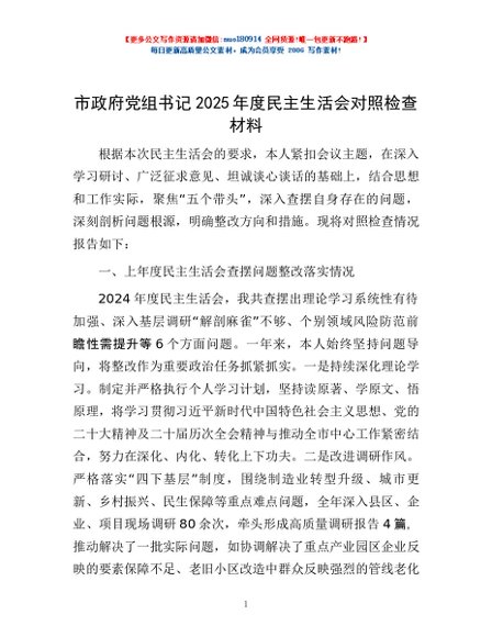 / 市政府党组书记2025年度民主生活会对照检查材料