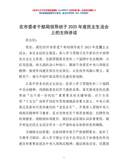 / 在市委老干部局领导班子2025年度民主生活会上的主持讲话