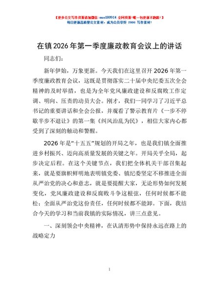 / 在镇2026年第一季度廉政教育会议上的讲话